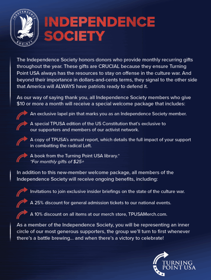JOIN US on the frontlines of the fight to reclaim America by becoming a member of Turning Point USA’s INDEPENDENCE SOCIETY!