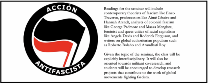 The syllabus further describes the course’s aim of surveying and drawing on “these antifascist traditions, linking them to a deep engagement with racial justice, antiimperialist movements, intersectional feminism, and an analysis of the changing character and contradictions of capitalism.”
