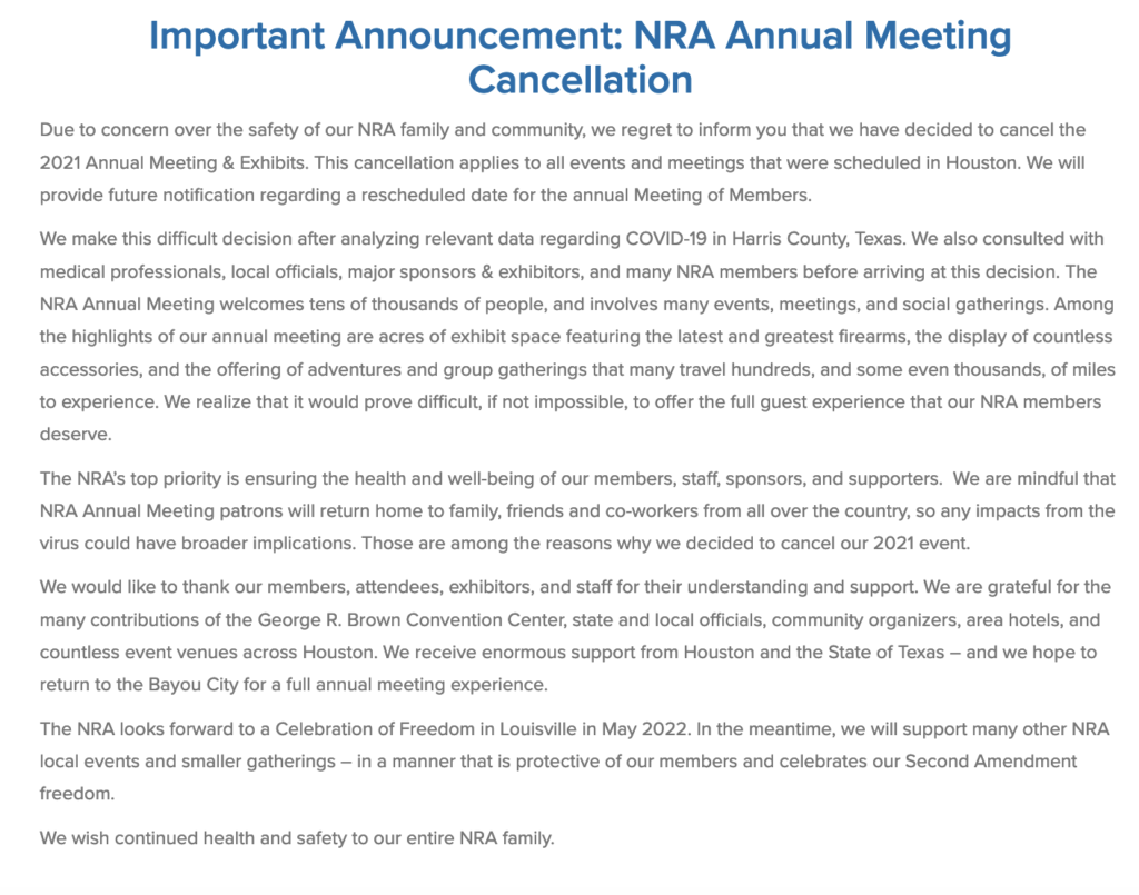 “Due to concern over the safety of our NRA family and community, we regret to inform you that we have decided to cancel the 2021 Annual Meeting & Exhibits,” the group said in a statement. “The NRA’s top priority is ensuring the health and well-being of our members, staff, sponsors, and supporters.”