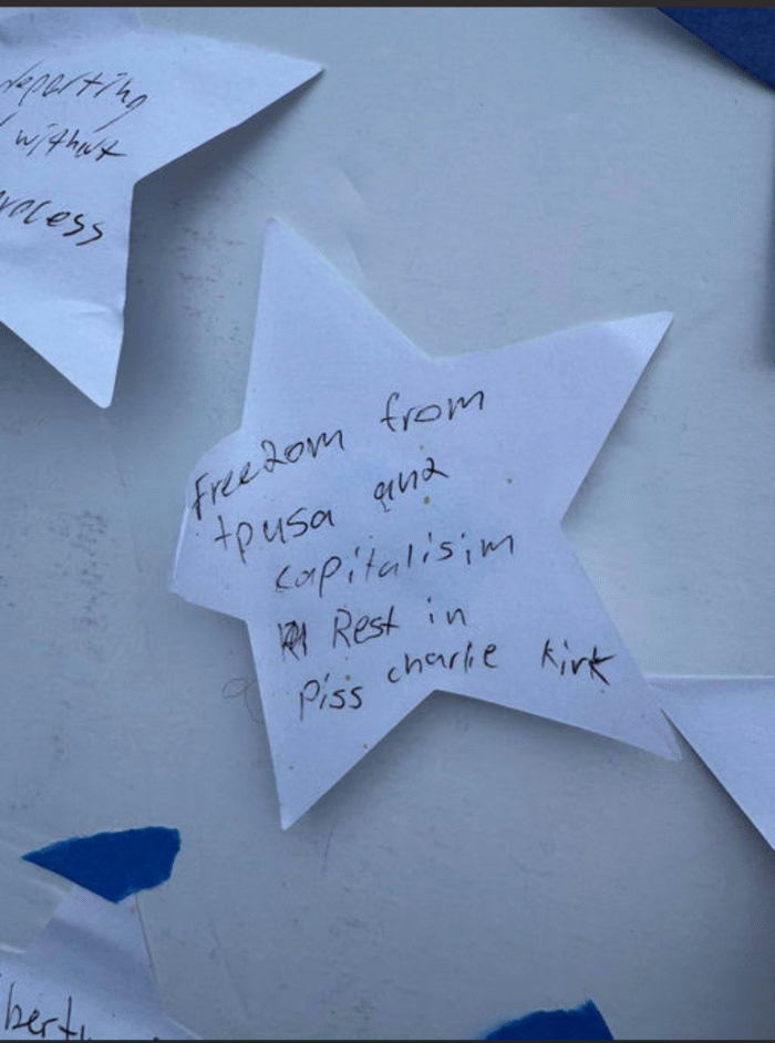 The table had a board allowing students to post statements about the meaning of freedom. One opposite-minded student posted a statement disdaining TPUSA, capitalism, and Charlie Kirk’s passing. (See image below).