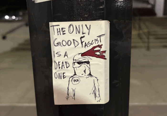 Displays recently posted near the school’s Lutheran Campus Ministry, Sterling Hall, and along University Avenue included messages such as “the only good fascist is a dead fascist.” Another depicted a pig being punched and bloodied. A separate graphic included the same phrase alongside “speak their language” and an image of a Ku Klux Klan hood with a gunshot wound in the head.
